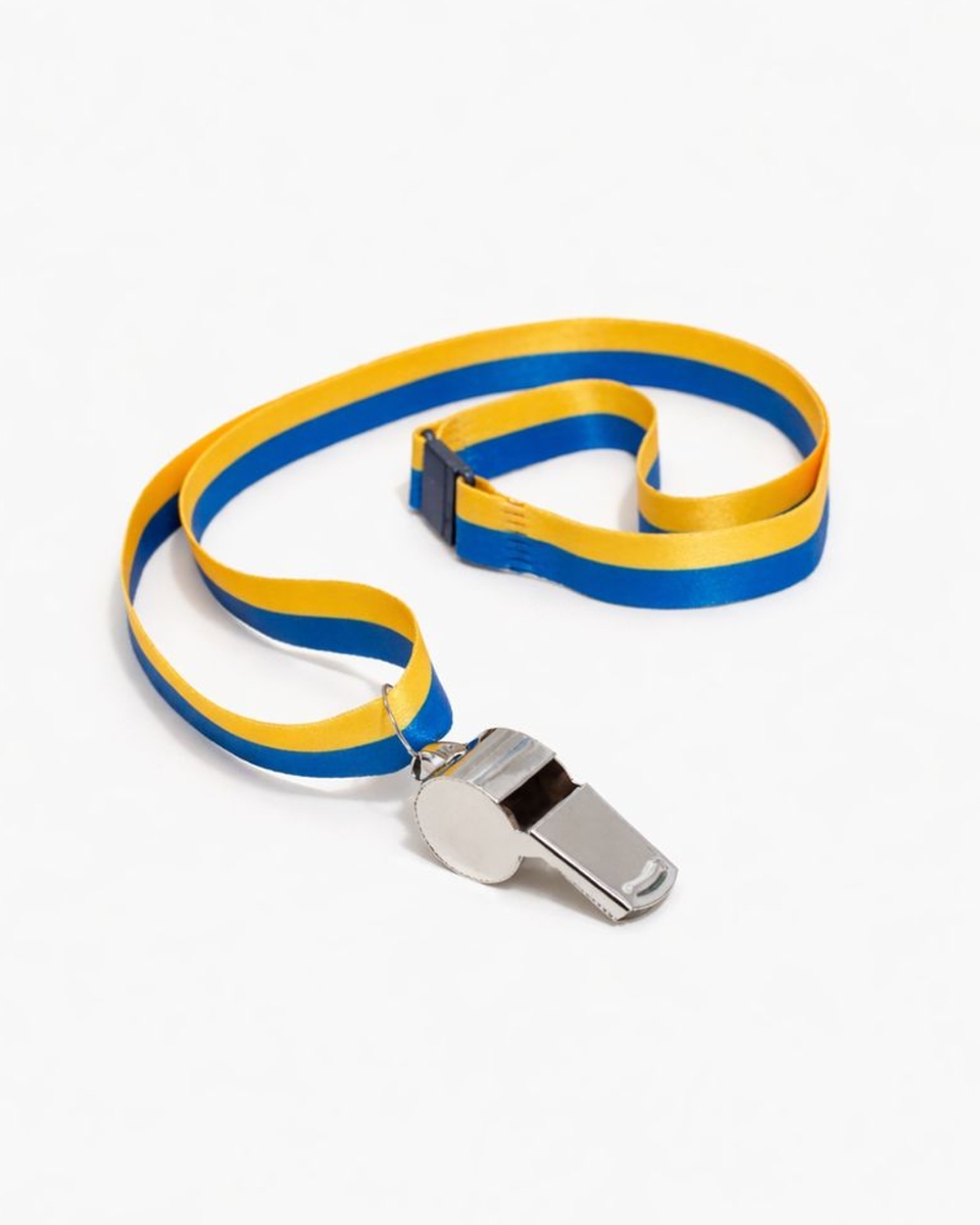 Visselpipa i Band Blå/Gul består av en visselpipa i stål som kommer på ett blågult band som du kan hänga runt studentens hals. Bandet har säkerhets-clips som förhindrar att den kan fastna kring halsen.